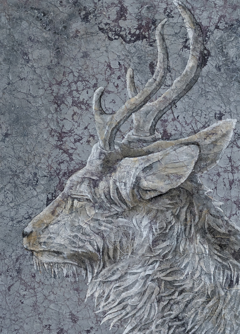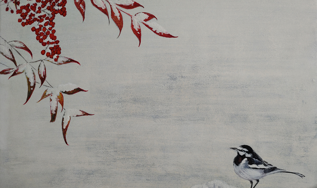 墨や胡粉、水干絵具、雲母といった日本画材の層を重ね、静けさの中にある生命の息づかいを表現し、モチーフ同士が主従を持たず、等しく在る関係性を描くことを試みました。 -