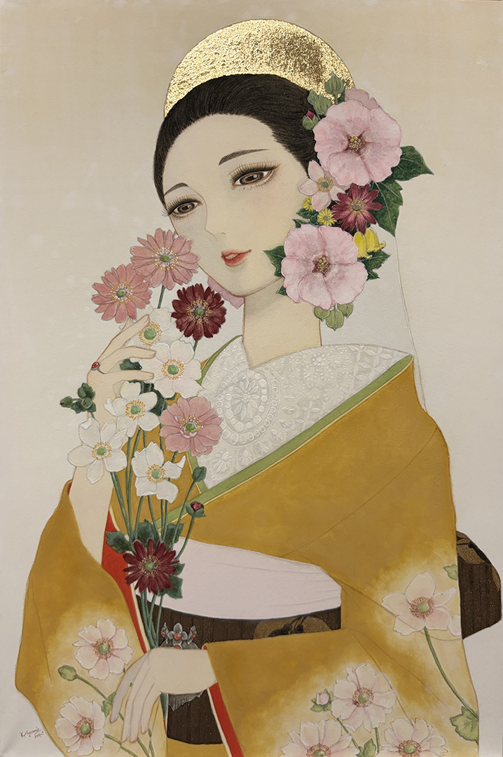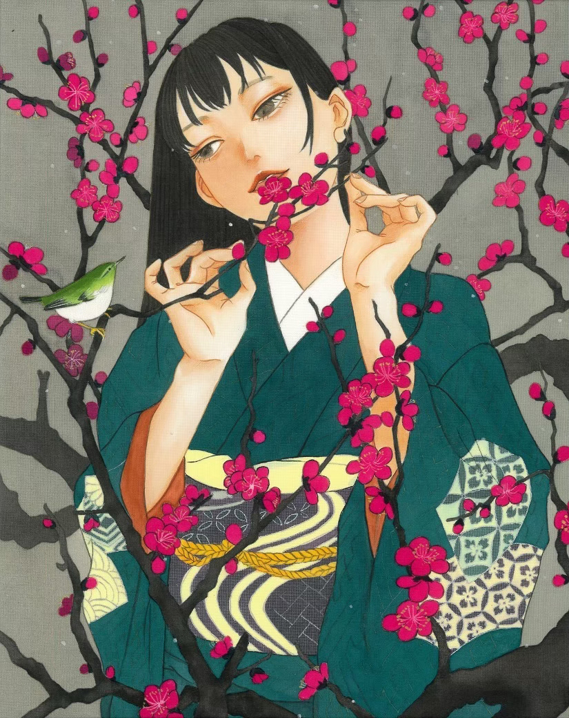 人と自然、装いと内面の境界を主題に、人物と枝、鳥を同一の気配として画面に配置しました。