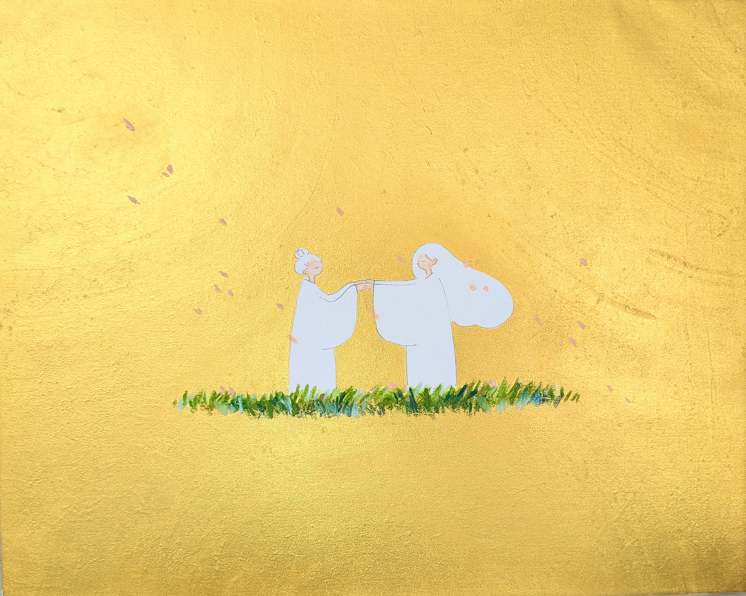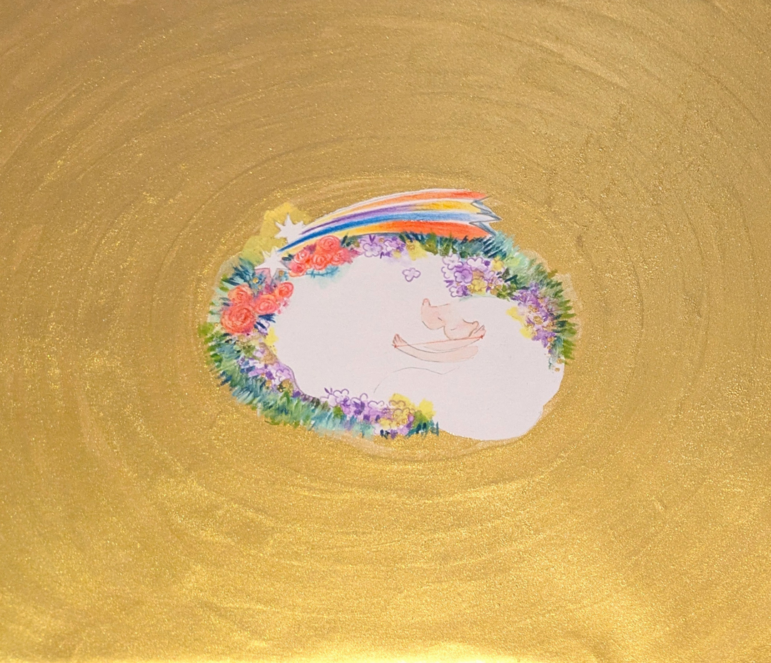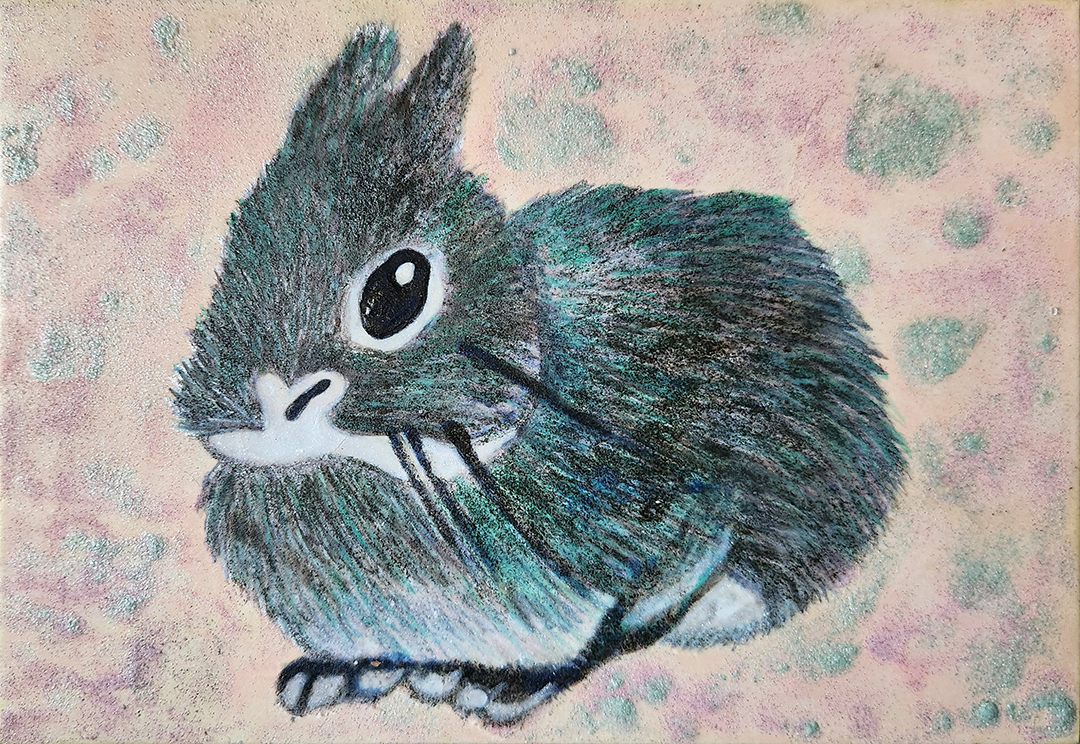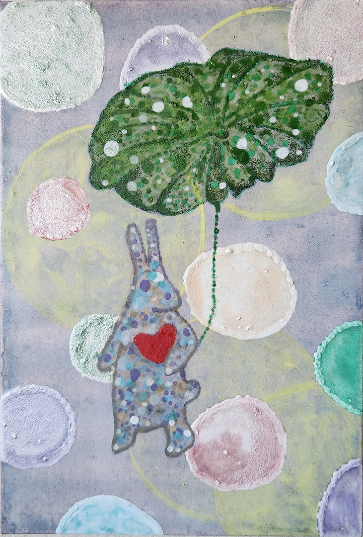 10年一緒に過ごした家族だったうさぎのばじる。亡くなって2年以上経つのに今でもふと触りたいと思ってしまう。岩絵の具を重ねてふわふわ感を出し、消えてしまいそうな脆さをシャボン玉を模した玉で表現。今も、このふわふわな温もりを触りたいと描きました。今も忙しい中で、この小さな温もり、優しさを充電させて欲しくて。