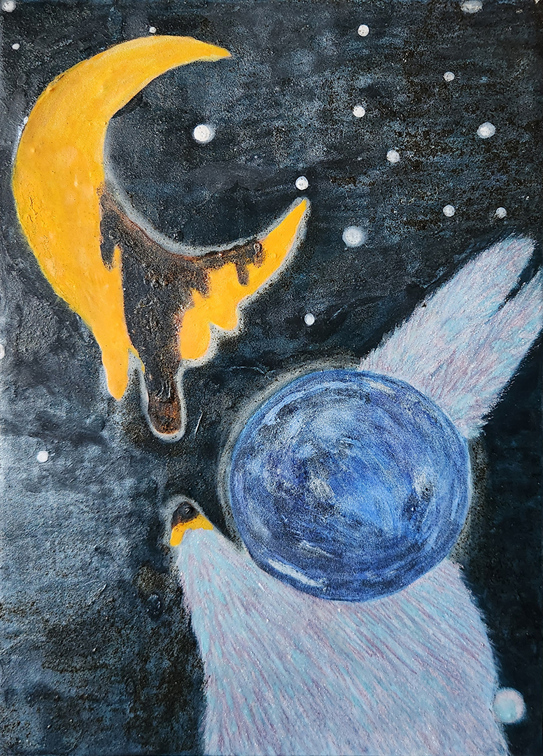 うさぎと家族を10年以上してきたので、寂しい気持ちが消えません。月を見上げるとうさぎが居ると聞きますが、私の横で月を見上げるとしたら、こんな食いしん坊で楽しそうな姿なのかなと。うさぎの顔を地球に模して、いつでも側に居たらいいなという想いを込めて