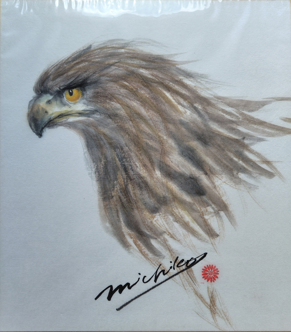若い鷹が思いどおりにいかなくて 憂いをおびた眼差しをしているのを表しました。