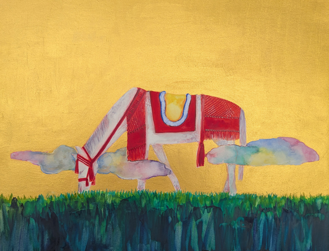 作品の左半分は、アクリル絵の具とカラー箔。右半分は、墨とカラー箔を使って、キリコの煌びやかさを表現しました。 -