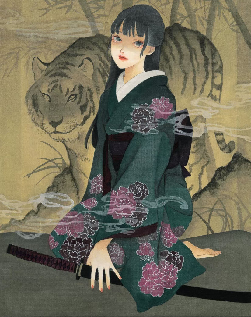 人物の背後に描かれた虎は、内面に秘めた覚悟や本能を象徴とし、
