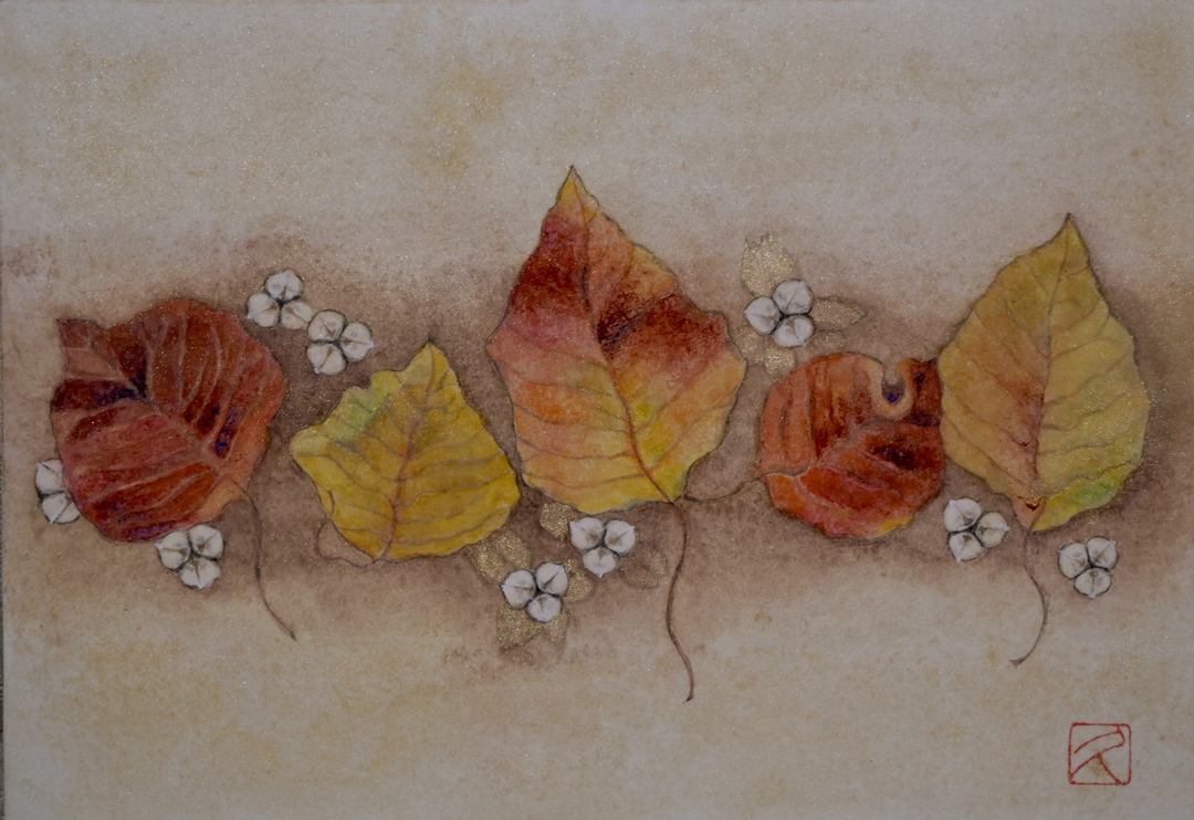 秋の到来に弾む気持ちを、ナンキンハゼの落ち葉と木の実で描いてみました。
