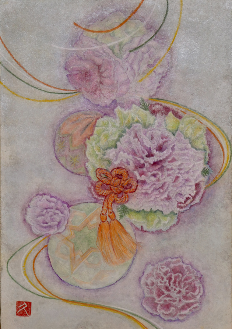 母の日に向けて描いた絵です。カーネーションのオーナメントと、人の気持ちが籠る手毬、組紐を配置させました。