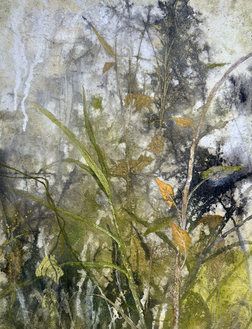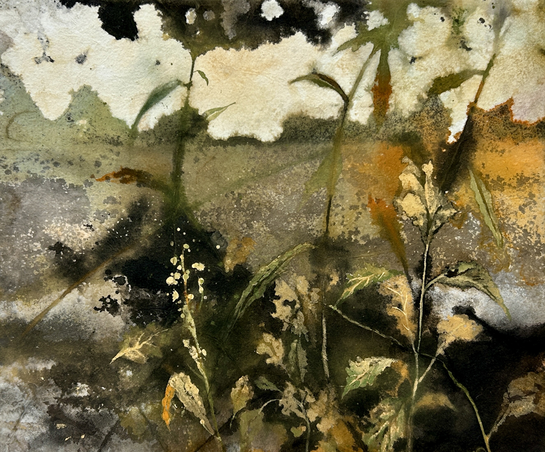 三本のセイタカアワダチソウが隣同士に生えていたものをスケッチしました。背景は想像ですが夕暮れ時にスケッチをしていたこともあり、温かなイメージを思い起こしました。草木同士が互いに身を寄せあっているようにも感じ、柔らかな印象を表現したいと思い、礬水液を引いていない生の状態の麻紙を使用しました。背景にのみ麻紙の裏側から礬水液を垂らして墨や絵具を弾くことで雲を表現しました。