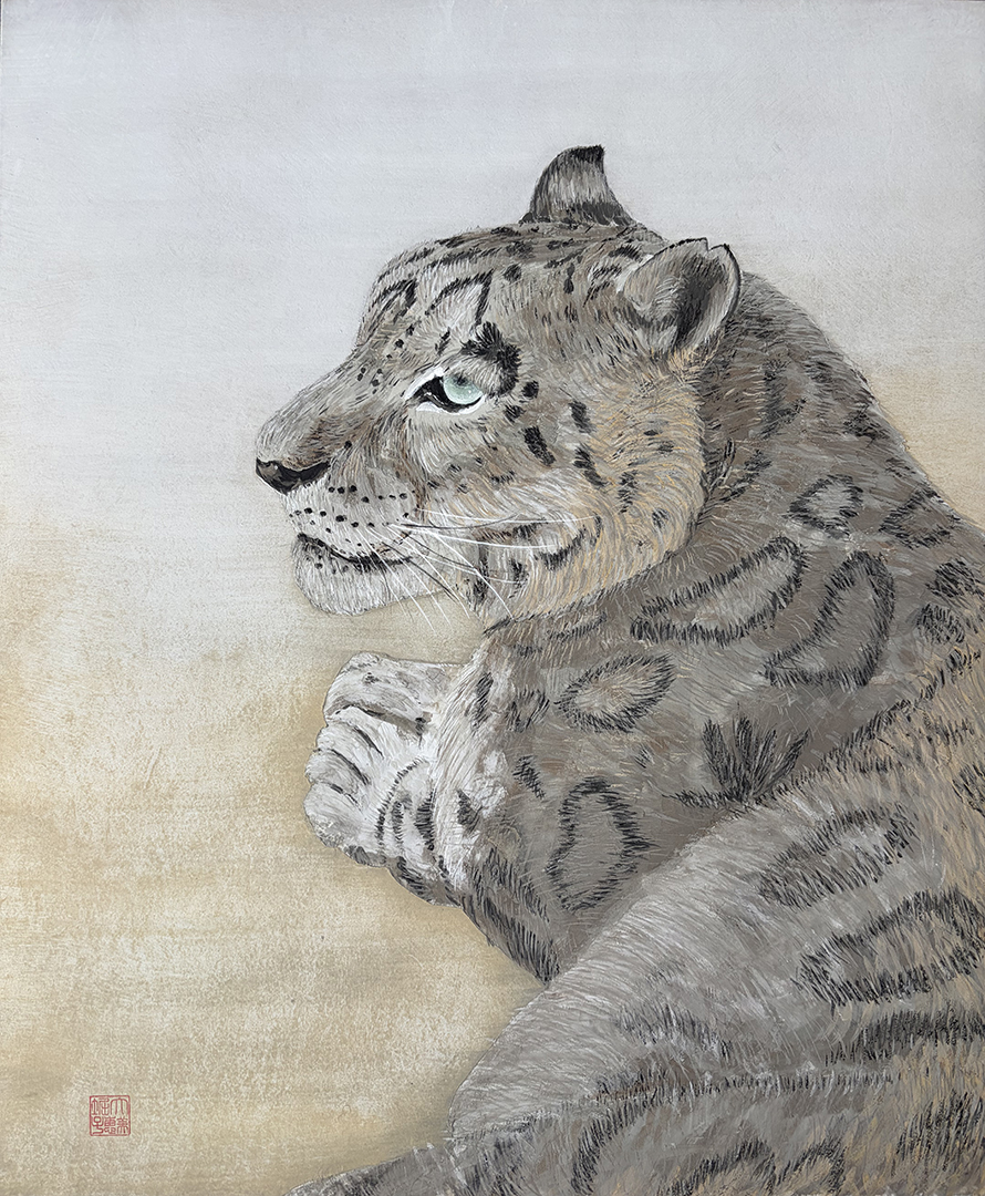 日の光を浴びた黒豹の毛並みの中に微かに隠れた赤茶色や紫などの色合い、そしてうっすらと浮かび上がる美しい斑紋に感動し、それらを銀箔を腐食させるという手法を使うことにより自然な色の変化をもちいることで表現しました。