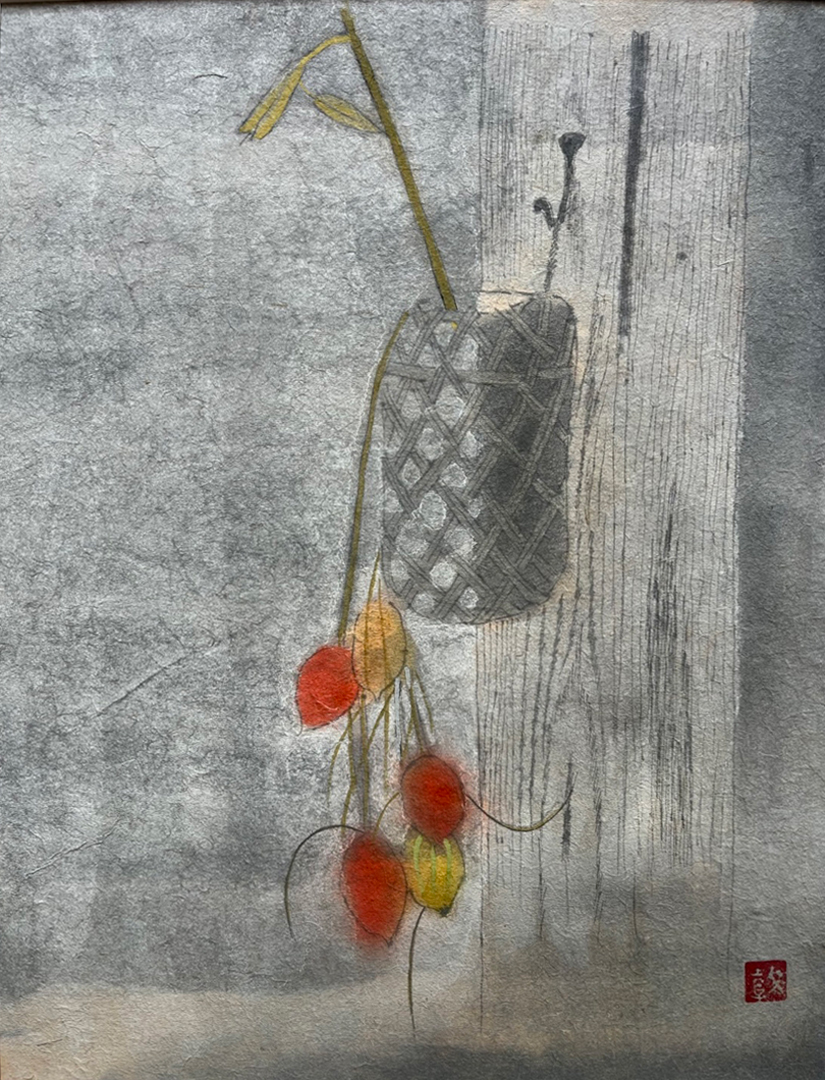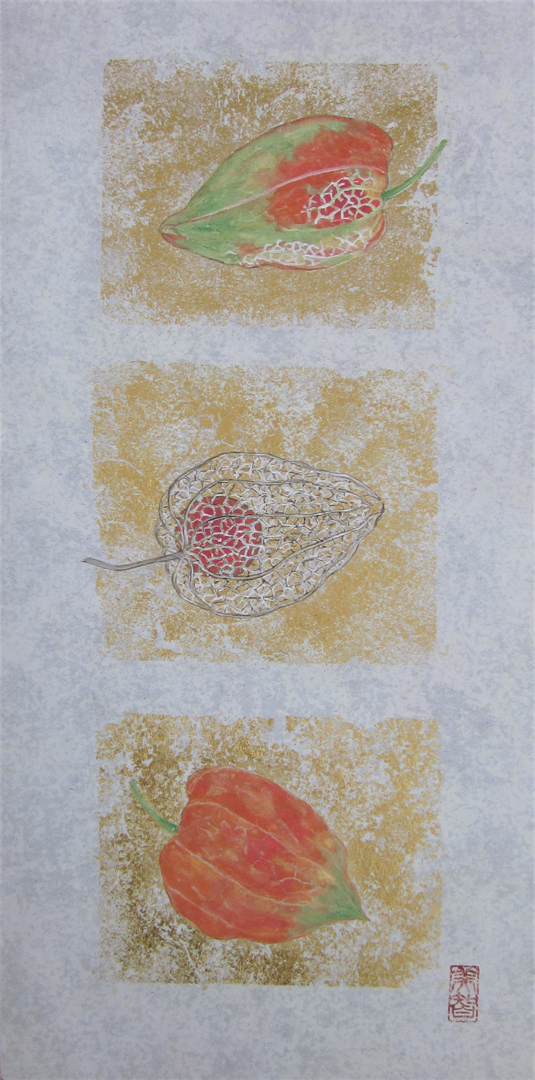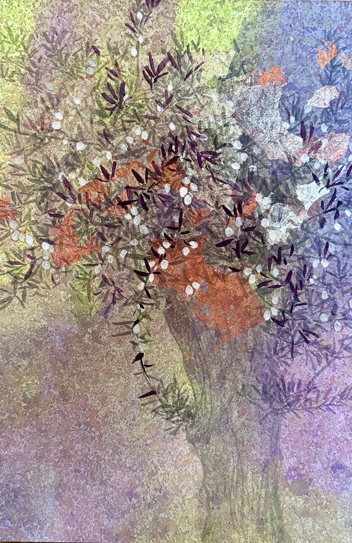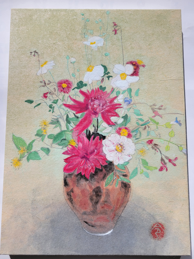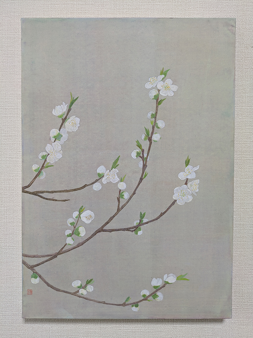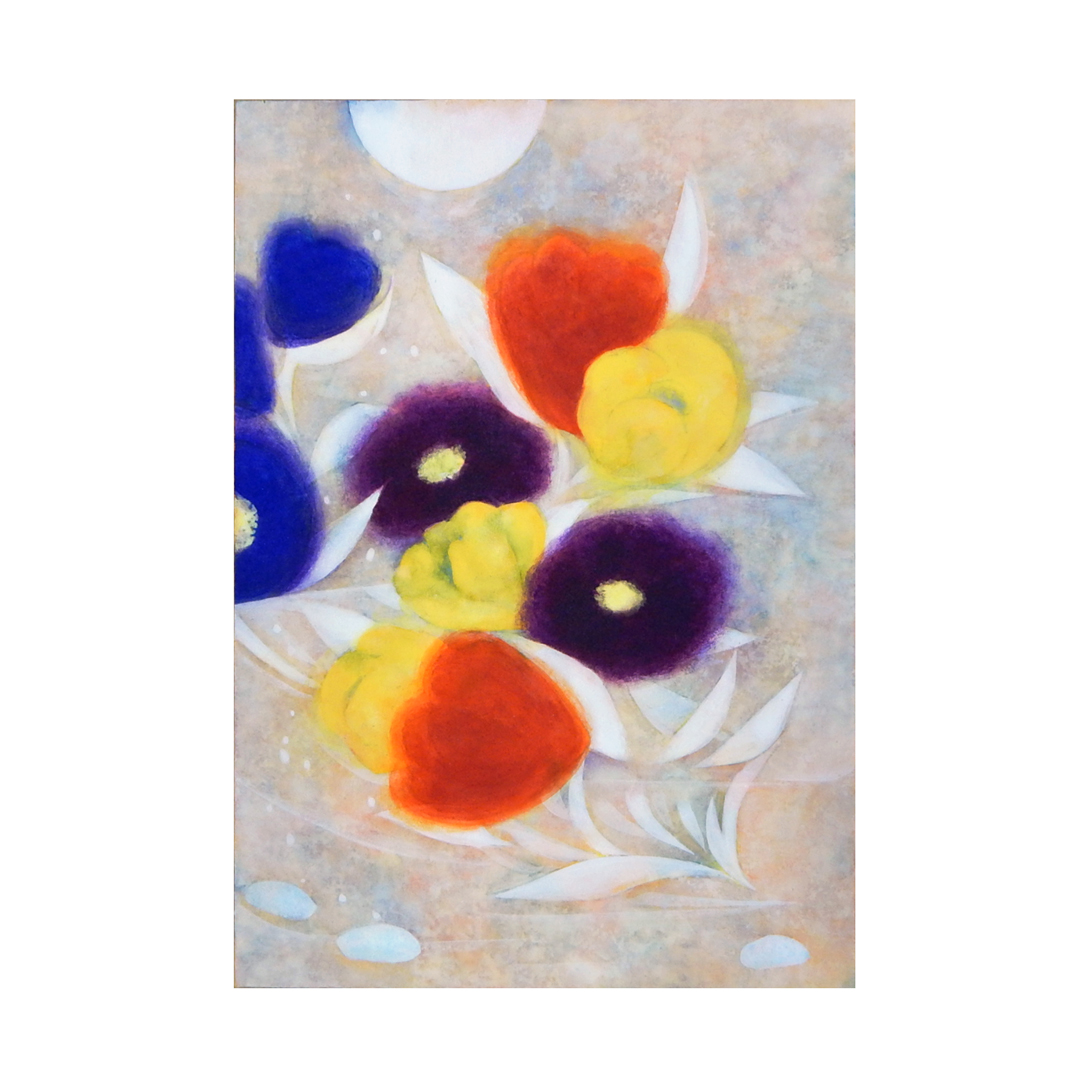フランネルフラワーを岩絵具や墨で描き、和紙をコラージュ的に貼って色面と空間の面白さを出そうとした。