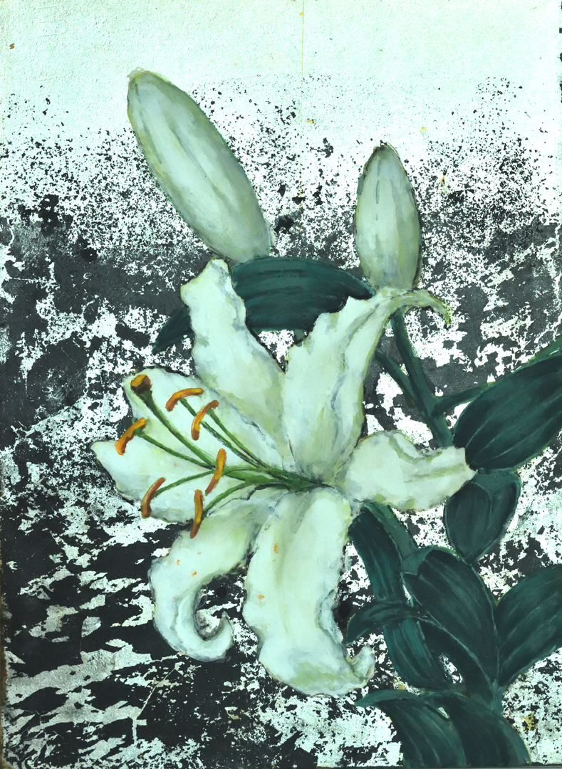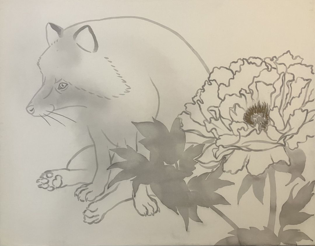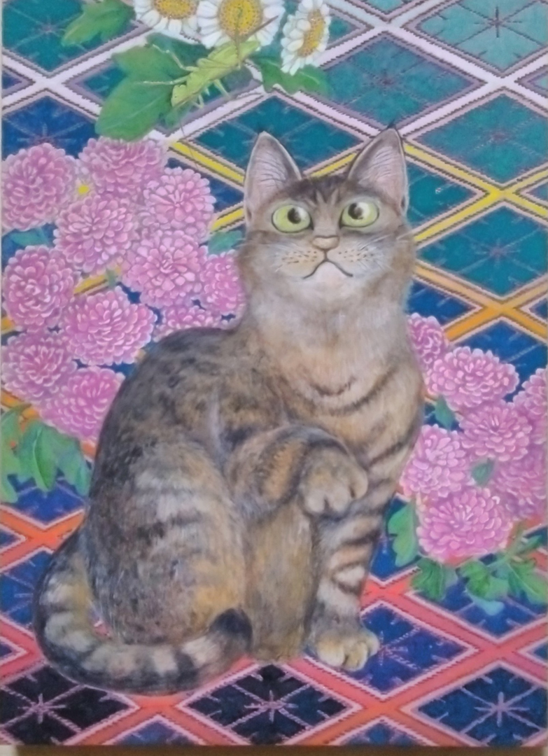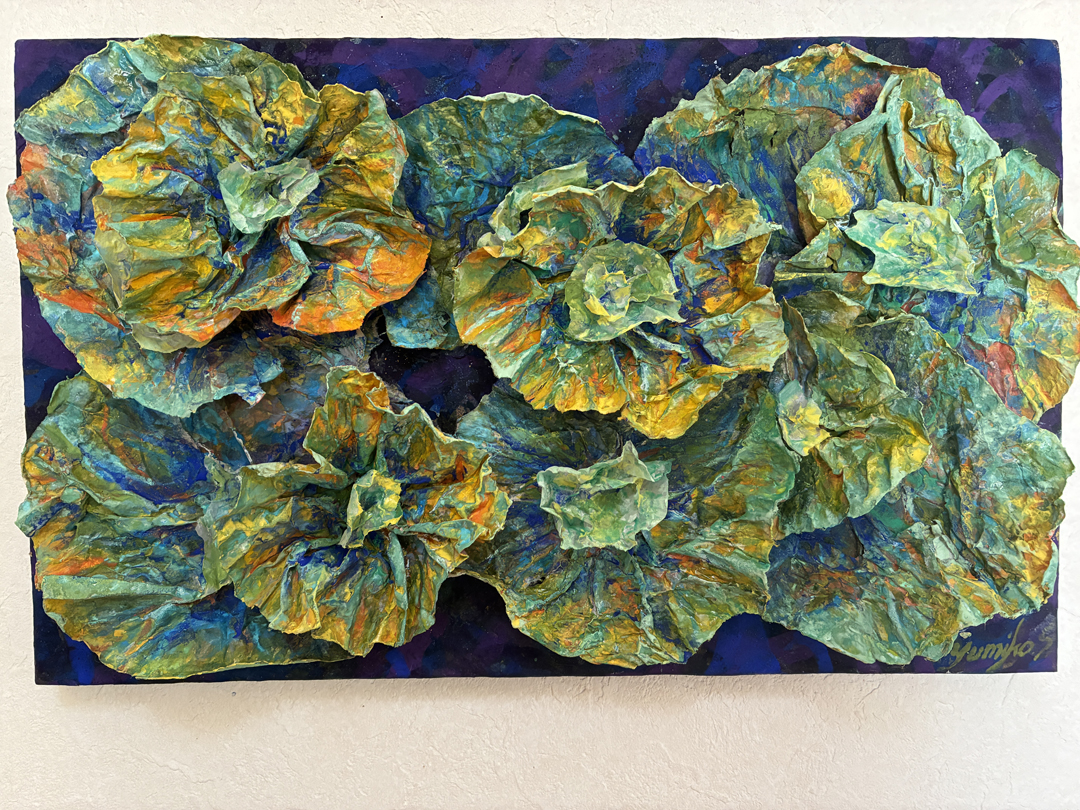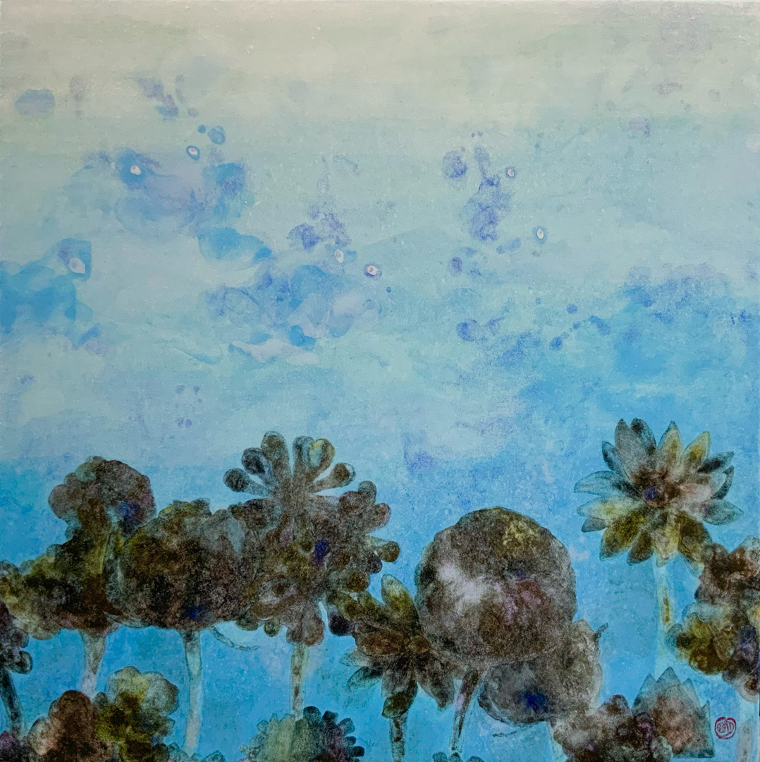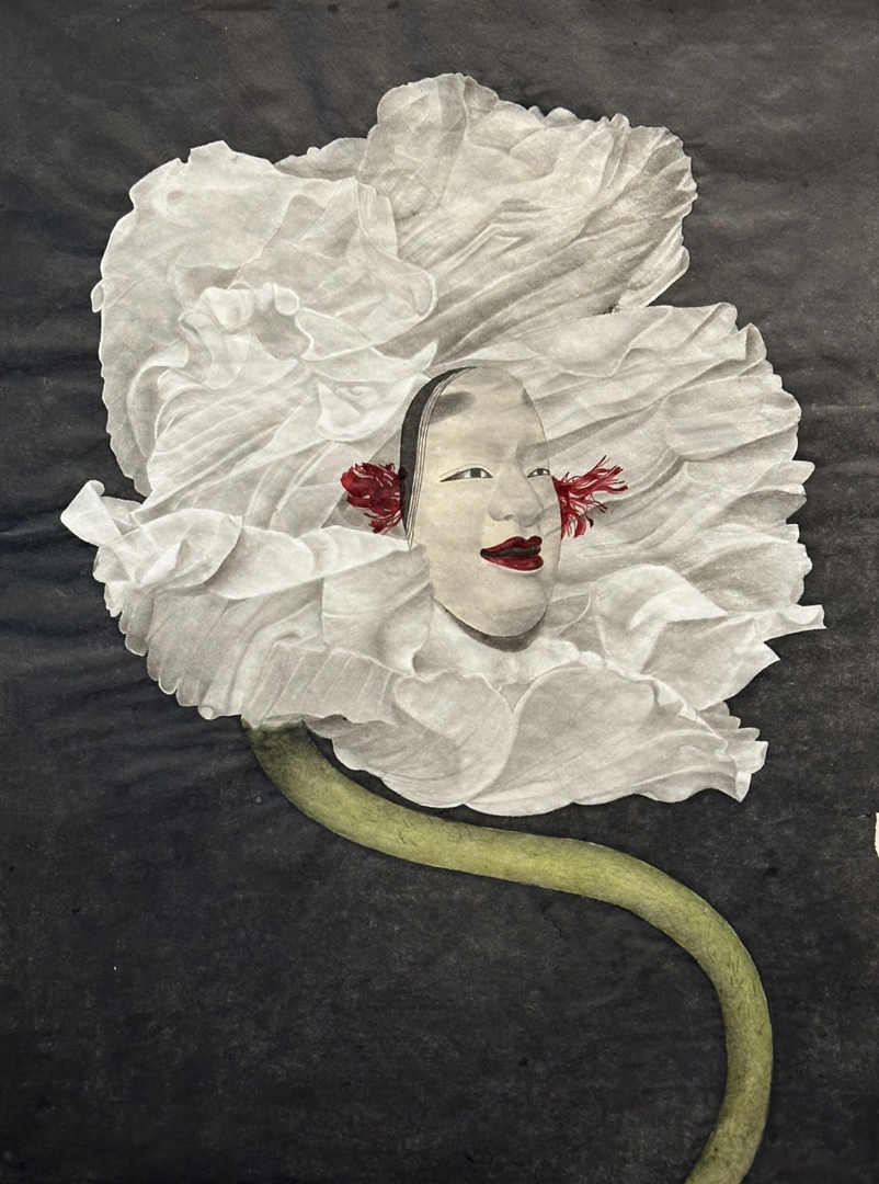 フランネルフラワーを岩絵具や墨で描き、和紙をコラージュ的に貼って色面と空間の面白さを出そうとした。
