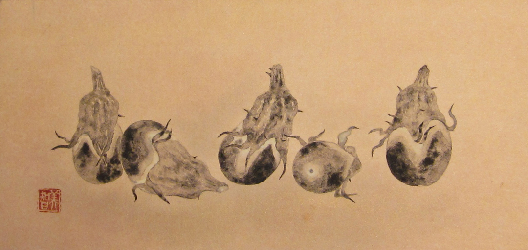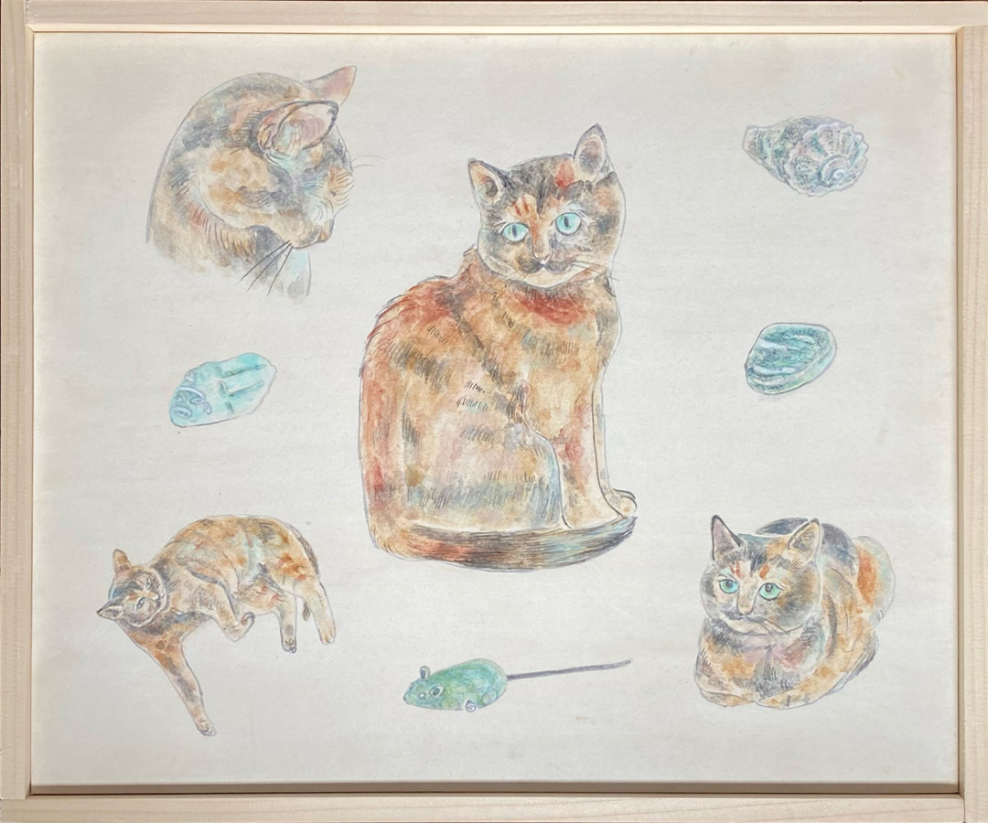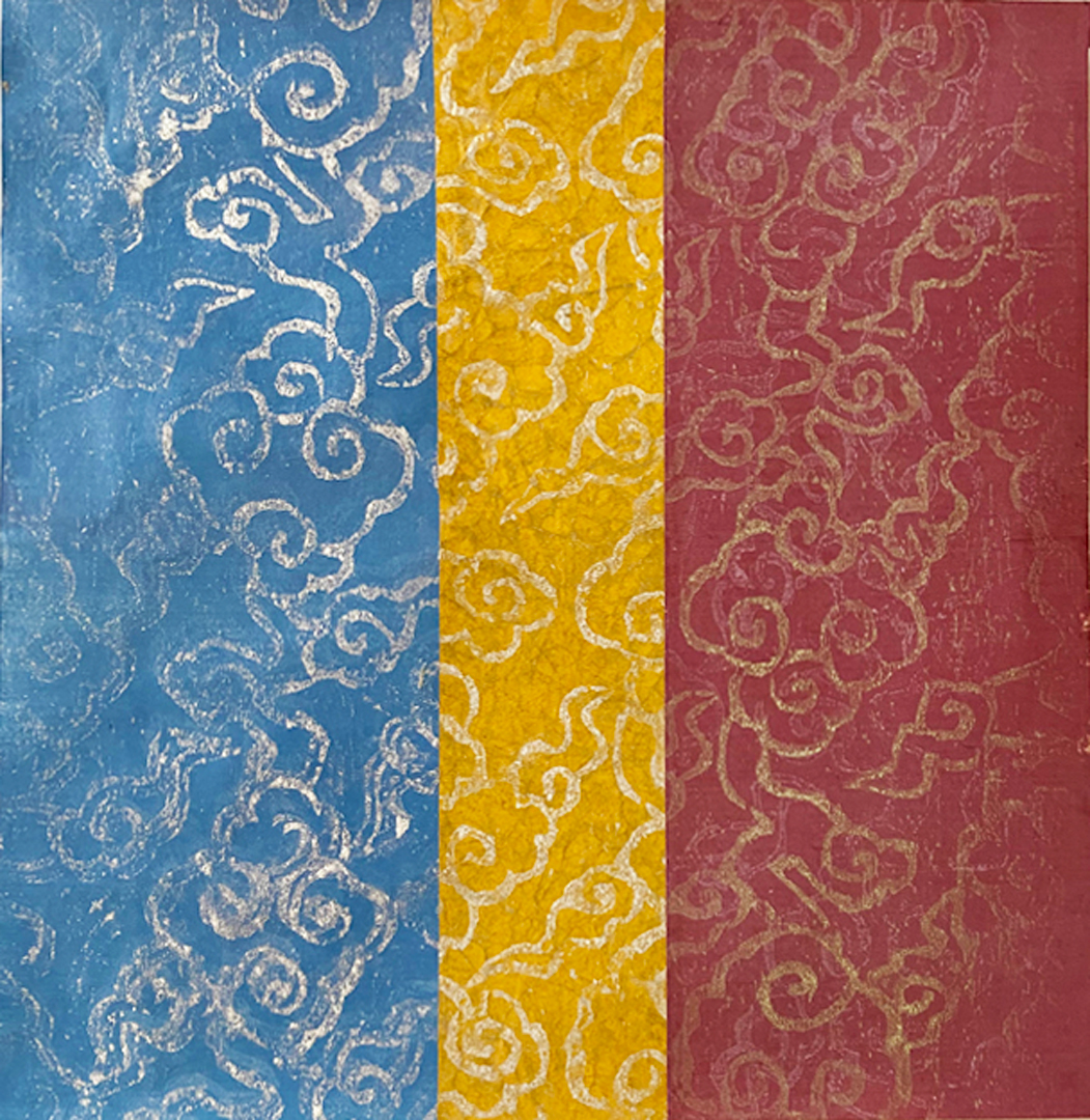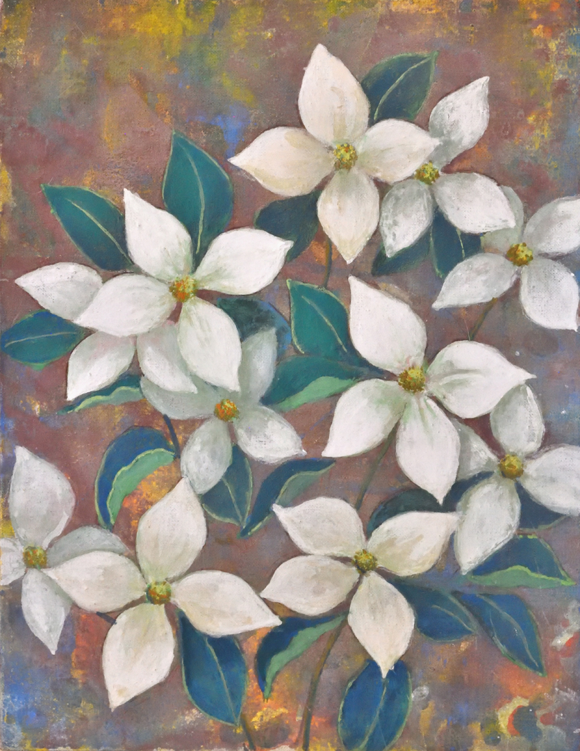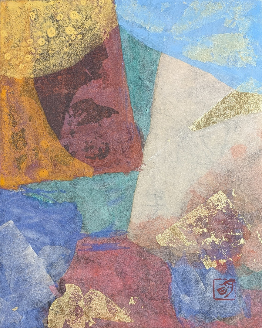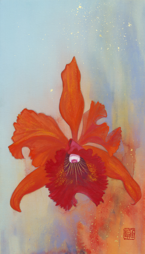 フランネルフラワーを岩絵具や墨で描き、和紙をコラージュ的に貼って色面と空間の面白さを出そうとした。