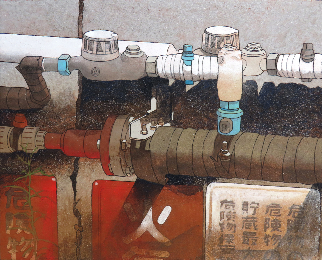 路地裏に静かにたたずむ配管群を描きました。表舞台に出ることなく、縁の下の力持ちとして存在する配管に月明かりが差し込み、その配管の時間経過や経年劣化の表情が美しく照らされる様に注目しました。