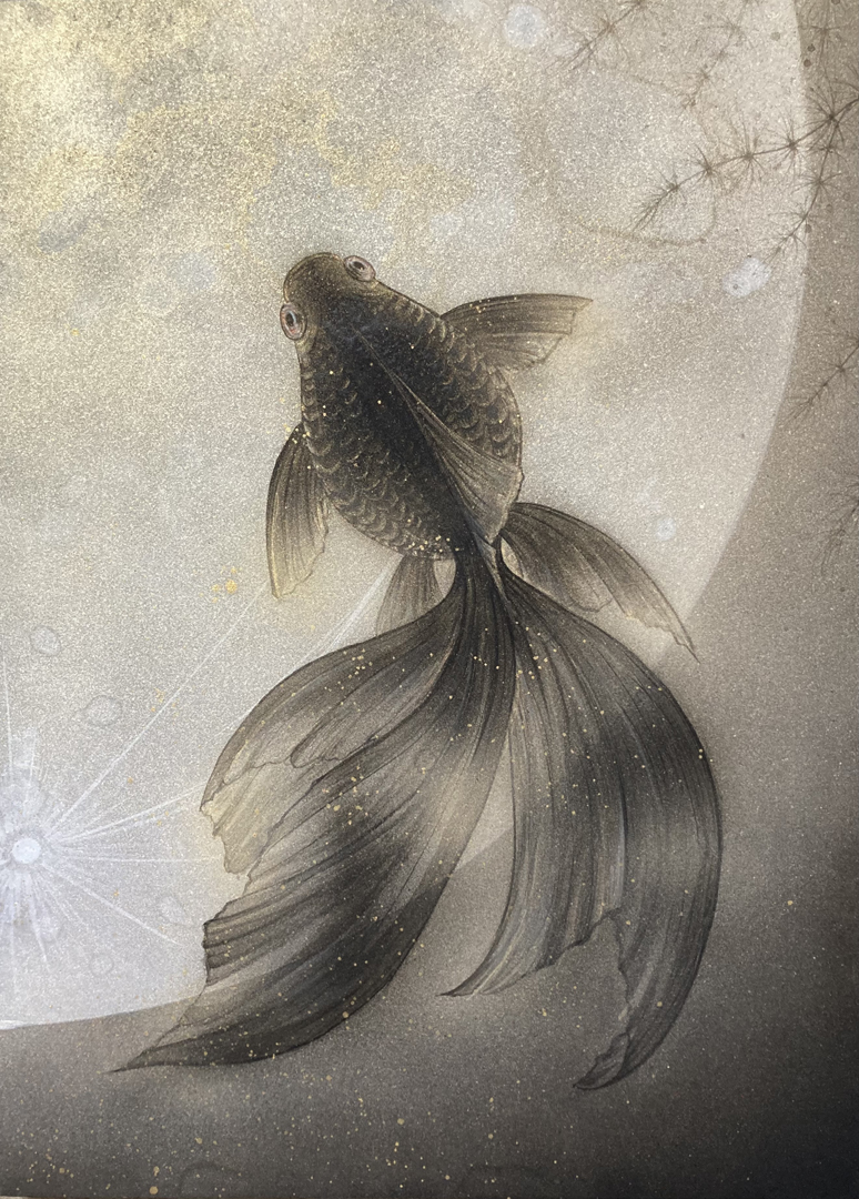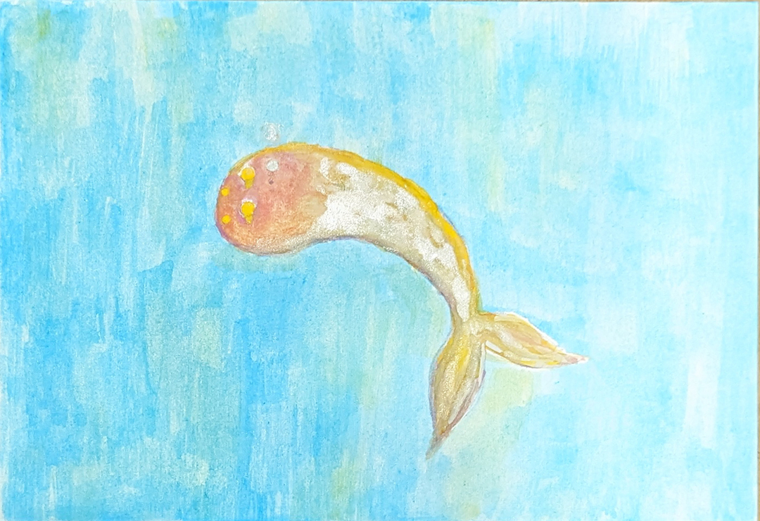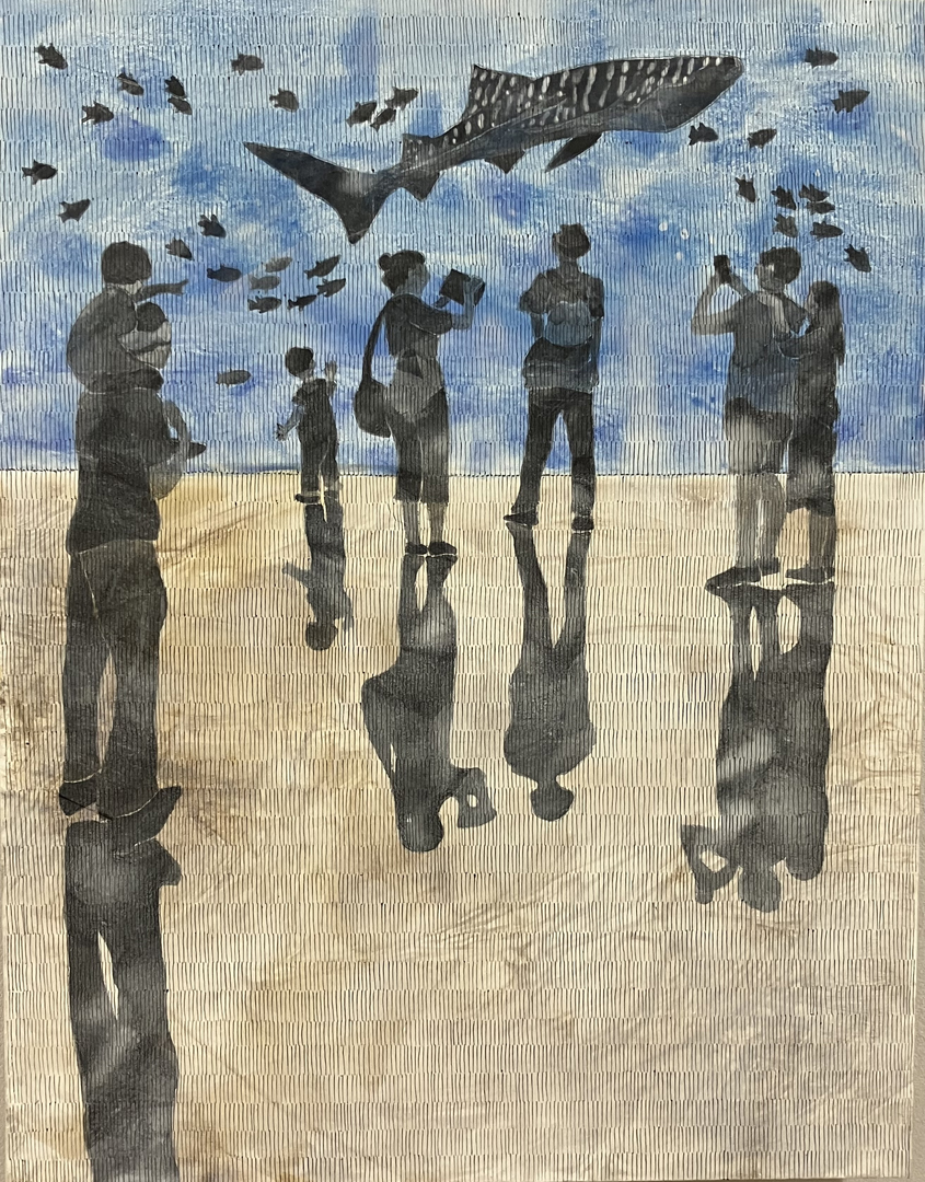スマホ等で撮影する人や魚に夢中の子供などあえてシルエットで描いているので、その表情は鑑賞者が想像して見て欲しいです。 -
