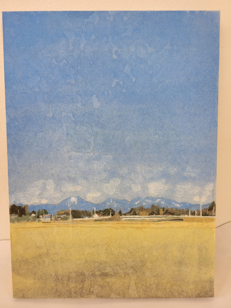 よく作るドリップコーヒーの作る過程から飲み切るまでの個人の心情を抽象として描いてみました。苦味や酸味など複雑な味を与えるコーヒーから確かに感じるリラックス感や安心感などをモチーフなしで岩絵具の色味で表現をしてみたらどうなのかと思い実践してみたのがきっかけです。岩絵具以外に少しジェッソも使用して材質の違いから色から感じる印象に変化を感じてもらえたらと思いながら色をのせました。