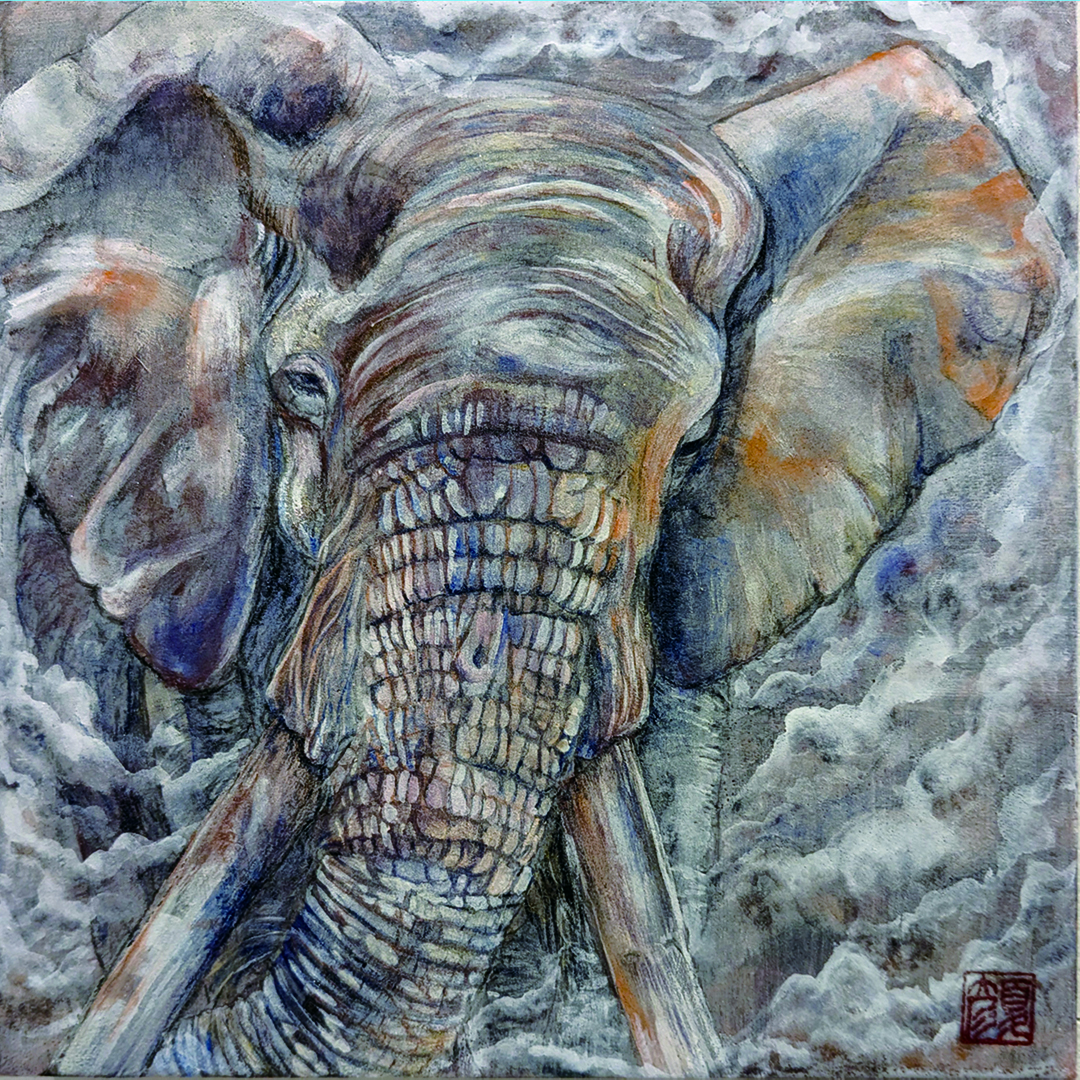 雲が風や雷、そして夏の熱を巻き込んで大きく動く様子を1つの大きな生き物として捉え、それらがまとまって移動する様子が「動物の群れ」のように感じたため、モチーフを象にしました。