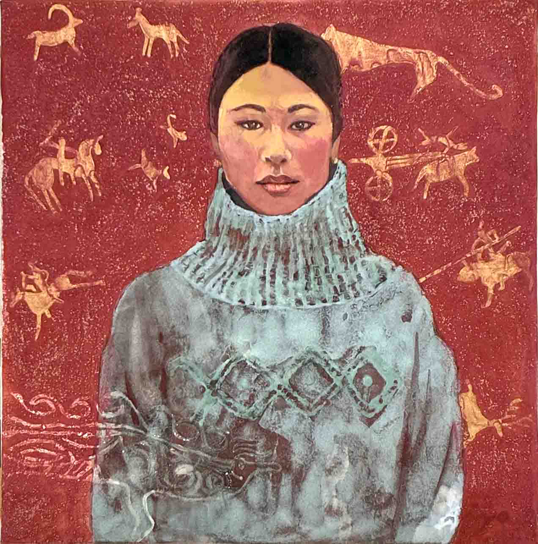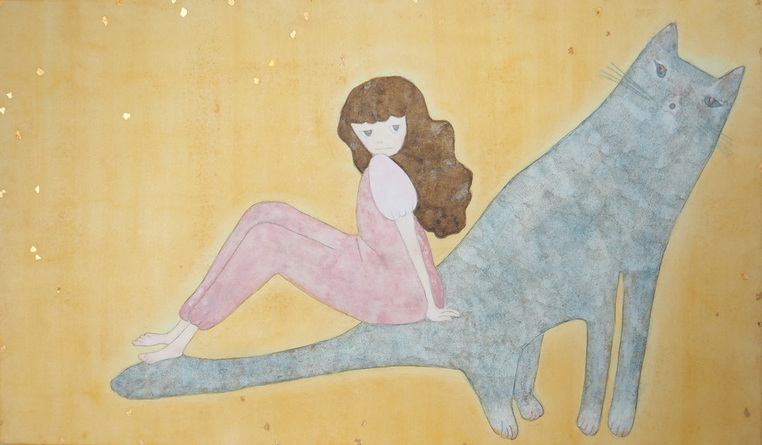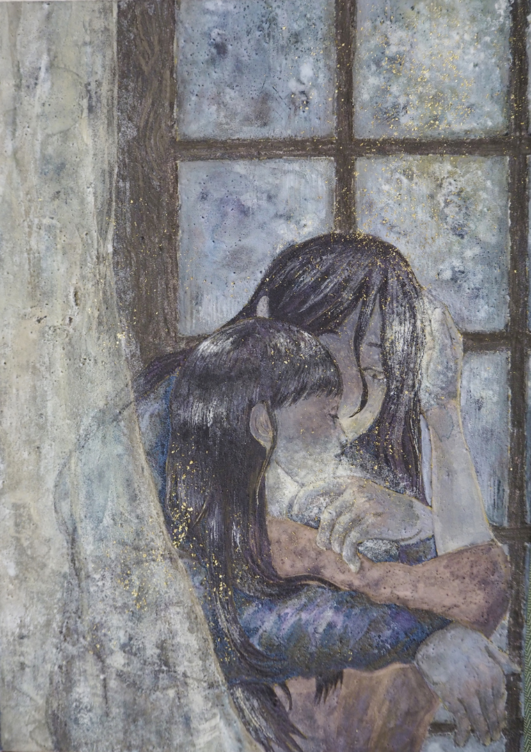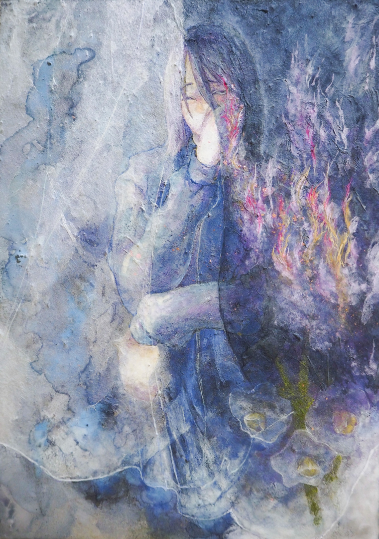 薄い和紙や薄く溶いた岩絵具を重ねて下の色が見えるようにし、隠した感情が透けていることを表しています。 -