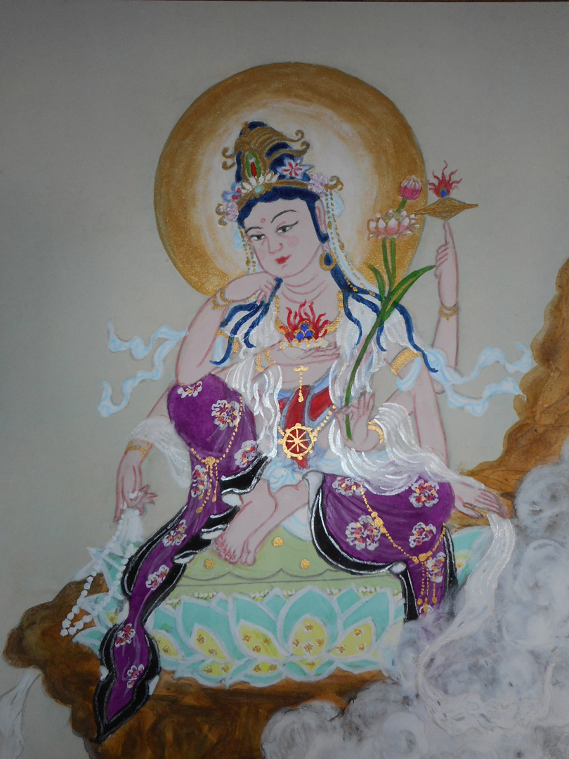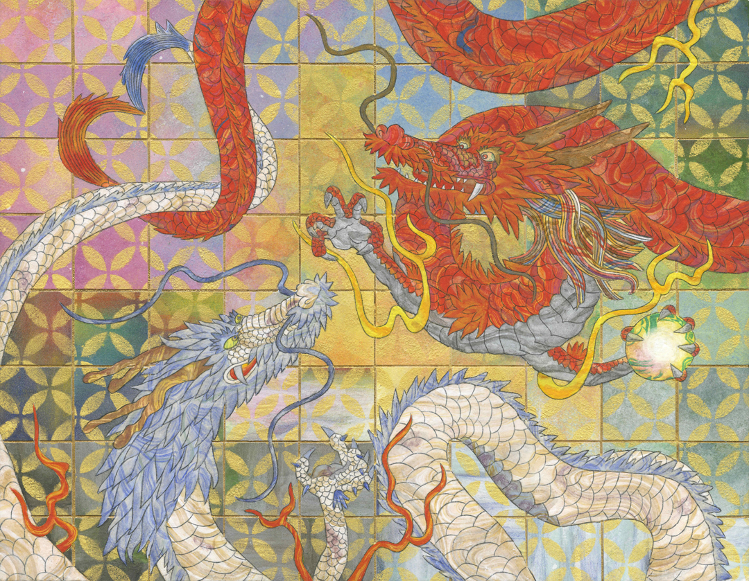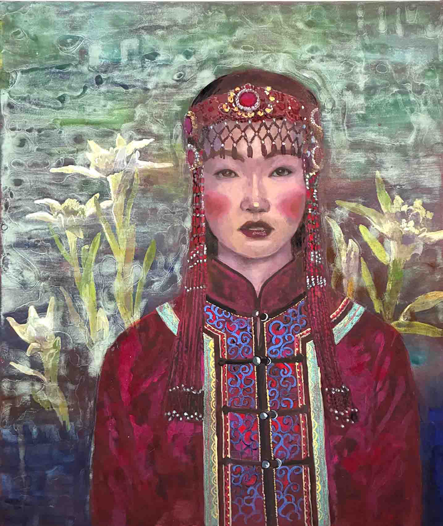 薄い和紙や薄く溶いた岩絵具を重ねて下の色が見えるようにし、隠した感情が透けていることを表しています。 -