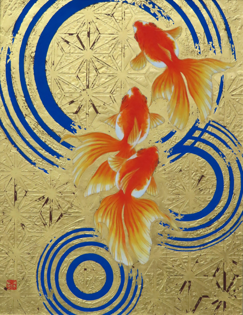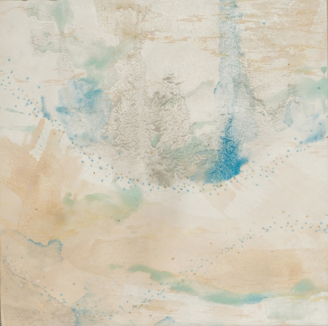 絵の具の垂らしや滲みを用いて、やきものの釉薬が生み出すような、自然に立ち現れる美しさを目指しました。
