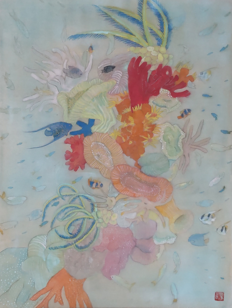 異なる環境で生きるサンゴ(海の生き物)とハナ(陸の生き物)の共演をテーマに、制作しています。